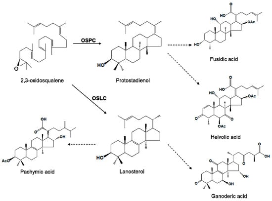 Steroidal triterpenoids such as ganoderic acid, pachymic acid, fusidic acid, and helvolic acid are produced by fungal cells. These compounds can protect fungal cells against other pathogens. Ganoderic acid and pachymic acid have anti-cancer, immune-enhancing, and anti-inflammation effects [1,2,3]. Fusidic acid and helvolic acid are widely used as antibiotics against Gram-positive bacteria. The biosynthesis mechanism of fusidic acid and helvolic acid has been recently elucidated using a heterologous expression system [4,5]. However, the pathway of other steroidal triterpenoid biosynthesis is not clear yet.