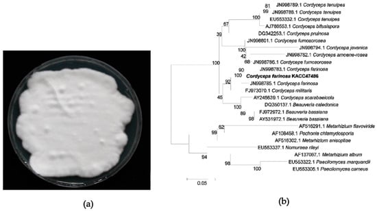 Identification of Cordyceps farinosa (KACC47486). (a) Strain of C. farinosa (KACC47486) cultured on PDA medium for two weeks; (b) Phylogenetic analysis using Neighbor-Joining method based on partial sequences of the ITS rDNA region.
