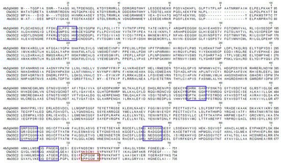 Alignment of amino-acid sequences of OSC genes in Cordyceps farinosa and Aspergillus fumigatus. Blue and red boxes indicate the QW(QXXXGXW) motif and the specific motif that plays a role in protostadienol production, respectively.