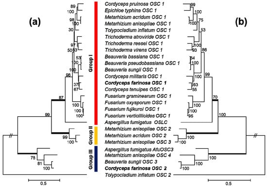 Phylogenetic tree of oxidosqualene cyclase (OSC) sequences extracted from selected Hypocreales species and inferred by neighbor joining (NJ, a) and maximum likelihood (ML, b) analyses. The number of changes among sequences is presented by branch length. The scale bar equals the number of nucleotide substitutions per site. Group I comprises genes homologous to lanosterol synthase (OSLC). Group III delimits orthologous of protostadienol synthase (OSPC). Three uncharacterized OSCs from Metarhizium spp. are nested in Group II.