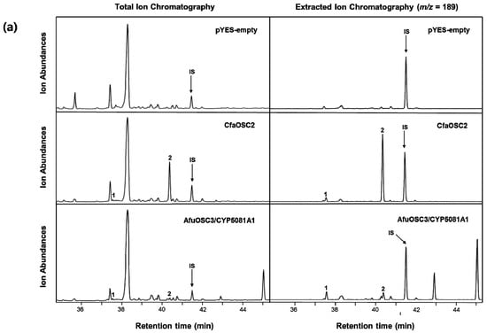 Functional characterization was carried out in yeast strain INVSc1 purchased from Invitrogen (Carlsbad, CA, USA). Yeast transformation and insert-DNA overexpression were carried out as described by Kushiro et al. [21]. Single clones including pYES–CfaOSC2 were incubated in 15 mL of a synthetic complete medium containing 2% glucose without uracil at 30 °C with shaking at 220 rpm for two days. After three-day induction with 2% galactose, cells from two 50 mL conical tubes were collected into one tube, refluxed with 8 mL of 20% potassium hydroxide (KOH) and 50% ethanol (EtOH), and extracted three times with hexane at the same volume. Extracts were concentrated under a stream of nitrogen gas (N2) and resuspended in 1 mL of chloroform (CHCl3). Subsequently, 100 µL of the extract was transferred into a new vial and concentrated under a stream of N2 at 70 °C. For GC–MS analysis, the extract was silylated with 50 µL of N,O-bis(trimethylsilyl)trifluoroacetamide (BSTFA) and 50 µL of pyridine for 30 min at 70 °C.