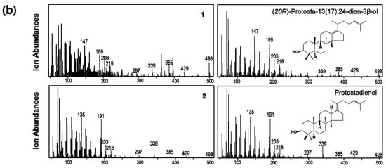 Full-length cDNA of CfaOSC2 was amplified using polymerase chain reaction (PCR) to elucidate the function of CfaOSC2 gene in steroidal triterpenoid biosynthesis. The full-length cDNA was cloned into a yeast expression vector pYES2.1 under the control of a GAL1 promotor. The CfaOSC2 gene functionally was characterized using a heterologous expression system in yeast INVSc1 that could endogenously synthesize 2,3-oxidosqualene. After three days of galactose induction, yeast cells were harvested and then extracted with hexane. To check whether or not alcohol triterpenes were extracted from yeast cells, we added lupeol as a internal standard before the extraction. Results of gas chromatography–mass spectrometry (GC–MS) analysis indicated that CfaOSC2-overexpressing yeast cells produced two products not present in control yeast cells carrying an empty vector pYES2 (Figure 5a). Peaks of yeast cells co-expressing AfuOSC3/CYP5081A1 as described by Mitsuguchi et al. [7] were used as authentic standards. Results of retention-time comparison indicated that these two products at a ratio of 5:95 were protosta-13(17),24-dien-3β-ol (1) and protosta-17(20)Z,24-dien-3β-ol (2, protostadienol), respectively. In addition, the pattern of mass fragments of these identified compounds in yeast cells overexpressing AfuOSC3/CYP5081A1 was compared. Results are shown in Figure 5b. Both peaks were alcohol triterpenes as they comprised the m/z 498 molecular ion which was trimethylsilylated (TMS). In addition, the characteristic fragment ions in MS spectrum of protostadienol were m/z = 191, 339 and 429, and these values were consistent with those reported by Ledro et al. [6] (Supplementary Figure S1). Therefore, CfaOSC2 is a multifunctional triterpene synthase producing compounds 1 and 2.