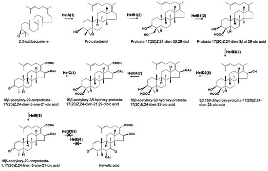 - Lv, J.M.; Hu, D.; Gao, H.; Kushiro, T.; Awakawa, T.; Chen, G.D.; Wang, C.X.; Abe, I.; Yao, X.S. Biosynthesis of helvolic acid and identification of an unusual C-4-demethylation process distinct from sterol biosynthesis. Nat. Commun. 2017, 8, 1644. [Google Scholar] [CrossRef]