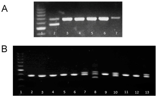 Panel (A). Heterozygous TCR-Vβ13 knockout founder among the first six LEW.1WR1 littermates (lane 2). The first lane is marker DNA; lanes 3–7 are wild-type. Panel (B). Heterozygous Ubash3a knockout founders among first derived progeny (lanes 7, 8, 10, and 13). Lane 1 is marker DNA; lanes 2–6, 9, 11–12 are samples from wild-type, non-deleted siblings. The founder used in this study is represented in lane 8 (Founder #7).