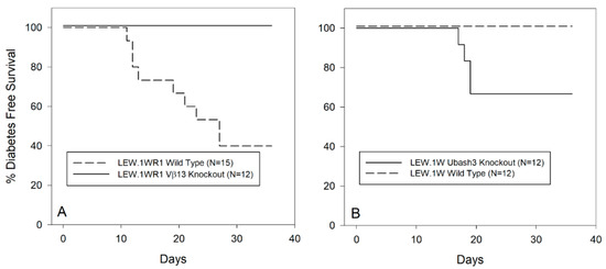 Panel (A). Frequency of diabetes in wild-type and Vβ13S1A1null/null LEW.1WR1 rats treated with poly I:C three times weekly as described in Methods. Rats deficient in Vβ13 are completely resistant to induction of T1D compared to parental strain, LEW.1WR1 rats. The two survival curves are statistically significantly different (p < 0.002). Panel (B). Frequency of diabetes in LEW.1W and LEW.1W Ubash3anull/null rats following treatment with poly I:C three times weekly as described in Methods. LEW.1W rats deficient in UBASH3A have significantly higher incidence of T1D than the resistant UBASH3A-sufficient LEW.1W parental strain (p < 0.04). Both strains carry RT1.B/Du.