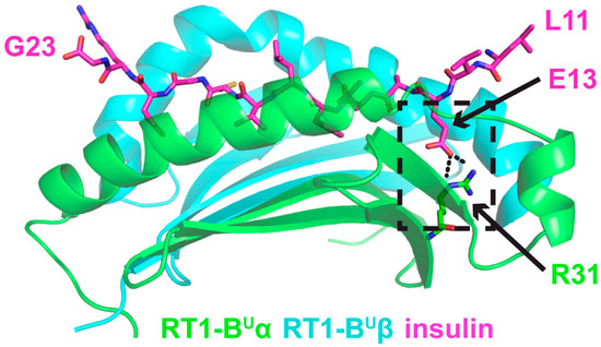 The model is shown in Figure 3. Insulin peptide residues 9 and 10 are not present in the coordinates of the structural model, as corresponding peptide residues are not present in the structural template, and they are predicted to be outside the MHC binding groove and distal from the TCR interaction site, thus likely irrelevant for complex formation. This peptide register on the MHC is reflective of the previously reported X-ray structure of this same peptide to the human DQ8 MHC [23], where insulin peptide residues 9 and 10 are likewise not present. This complex is predicted to be stabilized by a salt bridge interaction between insulin-E13 (glutamic acid at amino acid 13 of the insulin peptide) and arginine R31 of the MHC α chain in the RT1-Bu P1 pocket (Figure 3). Of great interest, in RT1-BL, residue 31 is glutamic acid [34], which would be unfavorable for interaction with the glutamic acid at insulin residue E13 due to electrostatic repulsion, and thus, may explain why RT1-BL is a resistant MHC haplotype.