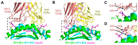 Two models of the putative recognition between the TCR and insulin peptide-MHC. (A) Model A shows the TCR with a canonical diagonal binding mode over the peptide, with a calculated crossing angle of 29° and limited tilt (4.8°), and the Vβ13 domain positioned over the C-terminal half of the peptide, which, as in Figure 3, is on the left. (B) Model B exhibits an alternative TCR engagement mode of peptide-MHC. For that model, a more tilted docking orientation (calculated tilt angle 16.5°) that leads to a greater engagement of the peptide MHC by the Vβ chain relative to the Vα chain. (C) A close-up view of the interface in Model A (boxed region in panel (A)) shows two Vβ13 CDR1 and CDR2 loop residues with identities specific to the Vβ13a allele (Q30 and K52) that are positioned to readily interact with the peptide-MHC. (D) A close-up view of the interface in Model B (boxed region in panel (B)) indicates that residue Q30 is likely to interact with the peptide-MHC, whereas K52 is not predicted to contact the peptide or MHC in that model. In all panels, peptide residues are shown in magenta with stick representation, and Vβ13 residues Q30 and K52 are shown in stick representation. MHC α chain residue E71, which is proximal to TCRβ residue Κ52, is shown in stick representation in panels (A) and (C). Close-up views in (C) and (D) are rotated slightly with respect to panels (A) and (B), to more clearly distinguish key residues.