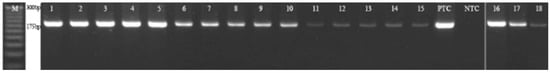 PCR result for the analyzed primers F3/R3. Results of the PCR reaction for the third primer pair. Lanes 1, 6, and 11—DNA of Rouen duck (French selection); lanes 16–18—DNA of Rouen duck (English selection); lanes 2, 7, and 12—DNA of KhO-1; lanes 3, 8, and 13—mix of Pekin duck DNA; lanes 4, 9, and 14—DNA of Dworka duck; and lanes 5, 10, and 15—DNA of Runner duck. Concentration of duck DNA: 100%—lanes 1–5; 0.5%—lanes 6–10; 0.05%—lanes 11–15, PTC—positive PCR control, NTC—negative PCR control, and M—the 25 bp step ladder.