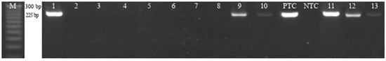 PCR result for the analyzed primers F4/R4. Results of the PCR reaction for the fourth primer pair. Lanes 1 and 11—100% DNA of Rouen duck; lane 2—DNA of KhO-1; lane 3—mix of Pekin duck DNA; lane 4—DNA of Dworka ducks; lane 5—DNA of Runner ducks; lane 6—DNA of other birds; lane 7—DNA of mammals; lane 8—DNA of plants; lanes 9 and 12—0.5% DNA of Rouen ducks; lanes 10 and 13—0.05% DNA of Rouen duck; lanes 1, 9, and 10—French selection; and lanes 11–13—English selection. PTC—positive PCR control, NTC—negative PCR control, and M— the 25 bp step ladder.