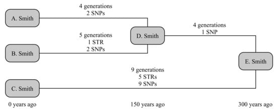 - Claerhout, S.; Roelens, J.; Van der Haegen, M.; Verstraete, P.; Larmuseau, M.H.; Decorte, R. Ysurnames? The patrilineal Y-chromosome and surname correlation for DNA kinship research. Forensic Sci. Int. Genet. 2020, 44, 102204. [Google Scholar] [CrossRef]