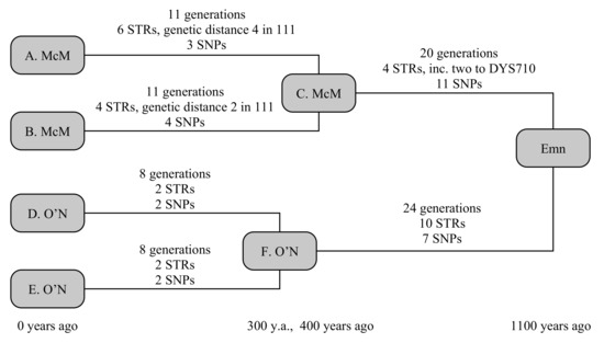 - Adamov, D.; Gurianov, V.M.; Karzhavin, S.; Tagankin, V.; Urasin, V. Defining a New Rate Constant for Y-Chromosome SNPs based on Full Sequencing Data. Russ. J. Genet. Geneal. 2015, 7, 68–82. [Google Scholar]