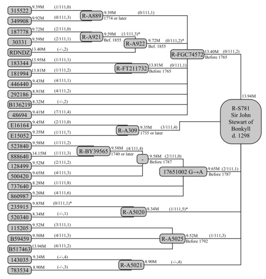 The author thanks the kind hospitality of the University of Strathclyde for the Honorary Fellowship they bestowed upon me, and from which this work results. I wish to thank Maurice Gleeson for careful reading and constructive feedback on the article, Alasdair Macdonald and Belinda Dettmann for their help with the Royal Stewart lines, and the many members of the Y-DNA testing community—particularly the R-U106 haplogroup project members—whose relentless desire for knowledge of their ancestors has been the motivation for this work.