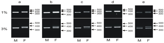 Different patterns of the PCR products representing the P2P8 marker obtained for male (M) and female (F) birds of Guaruba guarouba (a), Amazona barbadensis (b), Neopsephotus bourkii (c), Cacatua sulphurea (d) and Neophema pulchella (e) species and resolved in 1% or 3% agarose gel. Arrows and numbers correspond to location and size (in bp) of the DNA molecular marker run on the same gel.