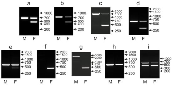 Different patterns of the PCR products representing the CHD1iA marker obtained for male (M) and female (F) birds of Ara chloroptera (a), Myiopsitta monachus (b), Forpus xanthops (c), Alisterus scapularis (d), Agapornis nigrigenis (e), Psittacula eupatria (f), Psittacula cyanocephala (g), Platycercus icterotis (h) and Orthopsittaca manilata (i) species. Arrows and numbers correspond to location and size (in bp) of the DNA molecular marker run on the same gel.
