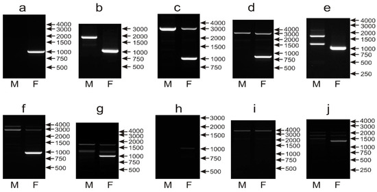 For the majority of the analyzed species, the same patterns were obtained when two programs were applied; only in 11 samples were differences observed and, in these cases, the pattern easier for interpretation was considered (the 1000 bp band present in the female sample, no or fewer unspecific bands). Sex determination with the CHD1iE marker was possible in 54 out of 64 species. In 38 species, the most typical pattern was observed with the CHD1W 1000 bp band detected in females, and no band obtained in the male samples (Figure 4a). In 10 species, in addition to the CHD1W band of 1000 bp, a single PCR product of 2000 bp (Cacatua sulphurea, Cyanoliseus patagonus) or 3000 bp (Guaruba guarouba, Pionites melanocephalus, Psephotus haematonotus, Agapornis roseicollis, Eolophus roseicapillus, Barnardius zonarius, Primolius couloni and Agapornis nigrigenis) was detected (Figure 4b–d). In 6 species, the 1000 bp band was amplified in the female sample, and sex determination was possible, but unspecific bands were visible (Figure 4e–g) in male (Psittacula derbiana, Aratinga nenday, Anodorhynchus hyacinthinus) female (Loriculus galgulus) or in both samples (Lophochroa leadbeateri, Psittacula eupatria). Finally, sexing was not possible in 10 species (Bolborhynchus lineola, Forpus crassirostris, Polytelis alexandrae, Polytelis swainsonii, Polytelis anthopeplus, Trichoglossus haematodus, Alisterus scapularis, Aprosmictus erythropterus, Chalcopsitta duivenbodei, Nestor notabilis), which yielded extremely weak (Figure 4h) or no 1000 bp band (Figure 4i,j).