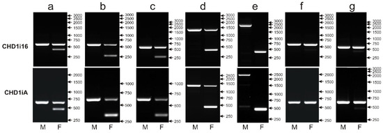 The CR1 retroposon insertion in the CHD1i16 turned out to represent the Z/W polymorphism detected earlier by Fridolfsson and Ellegren [12] and named CHD1iA. The PCR primers used by Suh et al. [14] to amplify polymorphic fragments annealed to sequences internal relative to the CHD1iA primers, and therefore, the amplified products were smaller—553 bp instead of 593 bp for chromosome Z and 406 bp instead of 447 bp for chromosome W (as predicted based on the CHD1 sequence of Gallus gallus). Indeed, while tested in parallel to CHD1iA, the CHD1i16 marker gave almost identical patterns for seven parrot species (Figure 5) selected to represent most common variants of CHD1iA: 600 bp (Z) and 450 bp (W) bands (Guaruba guarouba—Figure 5a), 600 bp (Z) and 260 bp (W) bands (Polytelis alexandrae—Figure 5b, Polytelis swainsonii—Figure 5c), 1400 bp (Z) and 450 bp (W) bands (Forpus crassirostris—Figure 5d), 2500 bp (Z) and 450 bp (W) bands (Psittacula derbiana—Figure 5e), a single 600 bp (Z) band in male and female samples (Neophena pulchella—Figure 5f), 600 bp (Z) and very weak 450 bp (W) bands (Barnardius zonarius—Figure 5g). Consequently, the CHD1i16 marker was based on the same polymorphism as CHD1iA and therefore, was not further analyzed.