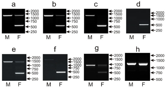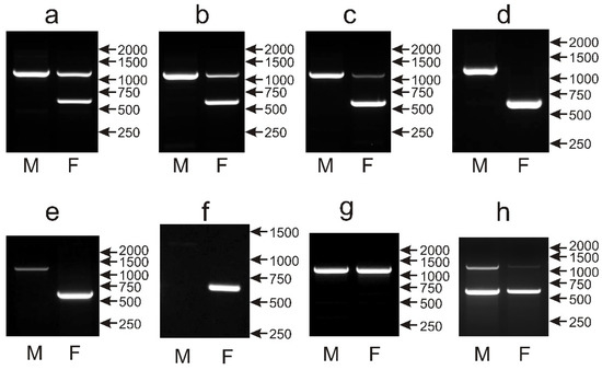 Different patterns of the PCR products representing the CHD1i9 marker obtained for male (M) and female (F) birds of Loriculus galgulus (a), Platycercus icterotis (b), Psittacula eupatria (c), Polytelis alexandrae (d), Lorius chlorocercus (e), Trichoglossus haematodus (f), Amazona autumnalis (g) and Orthopsittaca manilata (h) species. Arrows and numbers correspond to location and size (in bp) of the DNA molecular marker run on the same gel.