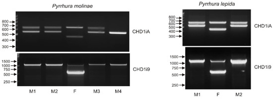 The patterns of the PCR products representing the CHD1iA (upper panel) and CHD1i9 (lower panel) markers obtained for male (M1, 2, 3, 4) and female (F) birds of Pyrrhura molinae and Pyrrhura lepida. Arrows and numbers correspond to location and size (in bp) of the DNA molecular marker run on the same gel.