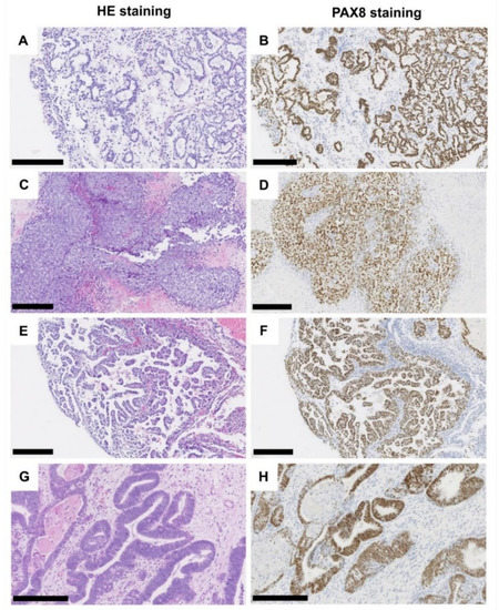 Histological characteristics of tumors of the Muellerian type. Clear cell adenocarcinoma, tubule-cystic growth pattern (A), HE, (B) PAX8 immunohistochemistry. Clear cell adenocarcinoma, solid growth pattern (C), HE, (D) PAX8 immunohistochemistry. Clear cell adenocarcinoma, (pseudo-/micro-) papillary growth pattern (E), HE, (F) PAX8 immunohistochemistry. Endometrioid adenocarcinoma (G), HE, (H) PAX8 immunohistochemistry. Black scale bar: 250 µM.