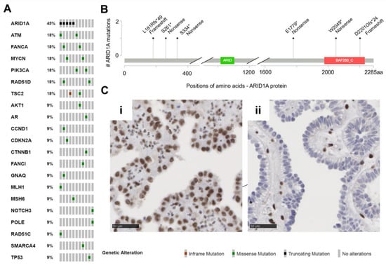No identical recurrent mutations were detected. Except for one ARID1A mutated case, in none of the tumor suppressor genes were two mutations of the same gene detected (patient MT-10). The most frequently mutated gene (5/11 patients, 45%, 6/32 variants 19%) in our cohort was ARID1A (Figure 2B). Interestingly, all six detected variants were clearly truncating mutations, which resulted in loss of protein in immunohistochemical analysis in only one patient (MT-6: p.Ser334*, Figure 2Cii). Two further ARID1A mutations led to a partial protein loss (MT-4: p.Ser261*, MT-5: p.Asp2201Glyfs*24), and the residual mutations (MT-7: p.Leu181Argfs*49) showed retained ARID1A protein expression or immunohistochemistry was not possible (MT-10: p.Glu1779*, p.Trp2049*). Further, mutations of ATM, FANCA, MYCN, PIK3CA, RAD51D, and TSC2 genes were observed two times each, while single changes in other genes were detected only once (AKT1, AR, CCND1, CDKN2A, CTNNB1, FANCI, GNAQ, MLH1, MSH6, NOTCH3, POLE, RAD51C, SMARCA4, TP53).