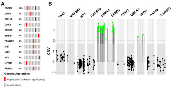 For most of the signaling pathways mentioned, disruption is known to have a strong driving effect on tumor development. Therefore, as with PI3K or DNA repair signaling pathways, they represent desirable and important targets for targeted therapies in advanced stage metastasized patients [23,24]. In general, an accumulation of alterations in DNA repair genes in a broader sense is striking in our cohort. Alterations affecting DNA repair are the focus of intense current research and clinical studies of several cancer types. For example, PARP inhibitors were FDA approved in prostate cancer with BRCA1/2 alterations and other homologous recombinational repair (HRR) genes such as ATM [25].