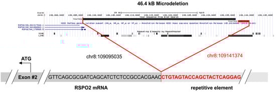 The 46.4 kB microdeletion of patient MT-2. In the upper panel, the deleted sequence is demonstrated. The chromosomal region was extracted from the UCSC genome browser (https://genome.ucsc.edu/, accessed on 15 April 2021) and the exact breakpoints are listed. The lower panel shows the fusion of the intronic repetitive element to the first (non-coding) base of exon 2. The sequence data were extracted from the original fastq file and were aligned to the reference genome GRCh37/hg19.