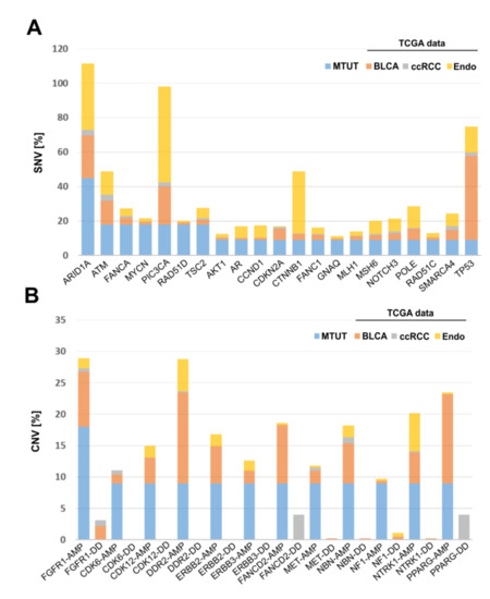 Publicly available datasets from The Cancer Genome Atlas (TCGA) were used to compare SNV and CNV data of the presented study with further cancer entities, i.e., bladder [11], endometrial [12], and kidney [13] cancer. SNVs, CNVs, and clinico-pathological data were obtained using the cBioPortal platform (https://www.cbioportal.org/, [9,10]) filtering for the identified genetic alterations of this study.
