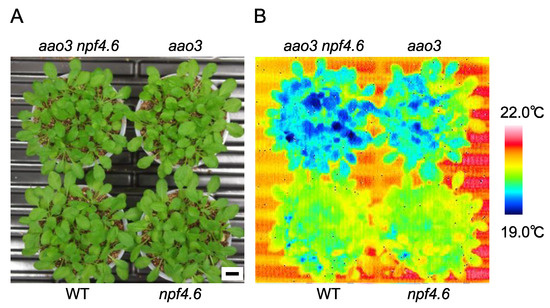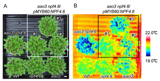 We previously showed that NPF4.6 functions as an ABA importer in Arabidopsis [35]. The inflorescence stems of mutants defective in NPF4.6 (npf4.6) had lower surface temperatures with more open stomata; however, the mutants did not show any clear leaf phenotypes, presumably due to redundancies with other ABA transporters. Therefore, the physiological roles of NPF4.6 remained not fully understood. To examine the contribution of NPF4.6 in the regulation of leaf stomatal apertures, we first investigated the effects of reduced endogenous ABA levels on the phenotypes of npf4.6. In Arabidopsis, there are four genes encoding aldehyde oxidase (AAO1-4) [53]. Although the AAO3 product plays a central role in the conversion of abscisic aldehyde to ABA, other isoforms could replace the function of AAO3, at least in the loss of function aao3 mutant background [45,53,54]. Therefore, aao3 has a relatively mild phenotype. When cultivated under well-watered conditions, aao3 did not show the growth retardation that is a typical symptom of mutants severely affected in ABA biosynthesis (Figure 1); however, the leaf surface temperature of the mutant was reduced compared to the wild type. In the same conditions, npf4.6 was not distinguished from wild type in terms of leaf surface temperature as we reported previously. Nevertheless, we found that the npf4.6 mutation was able to enhance the “cool” phenotype observed in the aao3 mutant background (Figure 1), indicating that NPF4.6 is potentially a positive regulator of stomatal closure.