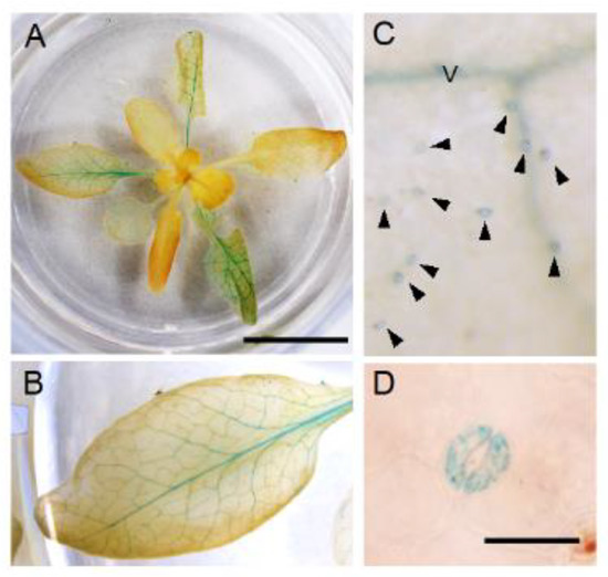Since the promoter activities of NPF4.6 were detected in the vascular tissues of leaves where ABA is supposed to be synthesized [35], we hypothesized that the protein regulates the amount of ABA transported from the tissues by mediating cellular ABA uptake. However, if this is the case, one may imagine that the loss of NPF4.6 function would result in an increased amount of ABA transported from the vascular tissues to guard cells and, hence, reduce the stomatal aperture (increased leaf surface temperature). One possible explanation for this unexpected result is that NPF4.6 is present also in guard cells and transports ABA into the cells. To examine this possibility, we generated transgenic plants that contained a transgene in which the GUS reporter gene was placed after the NPF4.6 genomic sequence so that the GUS fused NPF4.6 protein was expressed under the control of the NPF4.6 native promoter (pNPF4.6:gNPF4.6-GUS) (Figure 2). As in the case of simple promoter-GUS lines, GUS staining was clearly detected in leaf vascular tissues in the pNPF4.6:gNPF4.6-GUS plants (Figure 2A,B). In addition, closer investigation revealed that guard cells of the transgenic plants were also stained with GUS (Figure 2C,D). These results indicated that NPF4.6 is localized to both the vascular tissues and the guard cells.