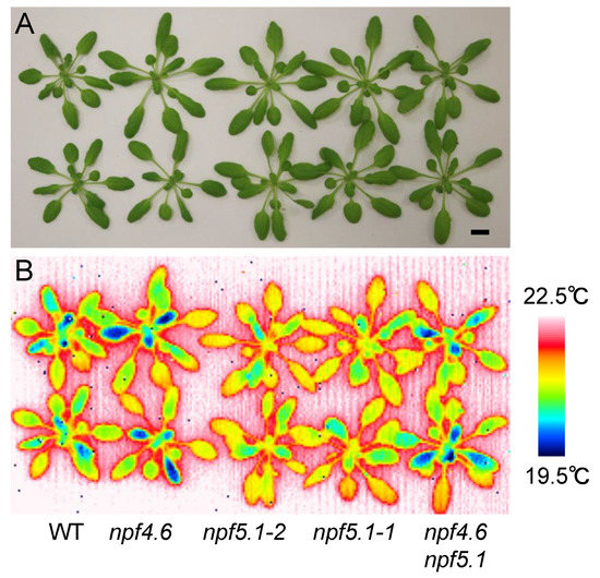 npf5.1 has a higher leaf surface temperature compared to the wild type. (A) Rosette leaves of wild type (WT), npf4.6-1 (npf4.6), npf5.1-1, npf5.1-2 and npf4.6-1 npf5.1-1 (npf4.6 npf5.1) plants (approximately 1 month old) grown under a day and night (10 h light/14 h dark) cycle. Scale bar = 1 cm. (B) Leaf surface temperature of plants in (A) observed by a thermal imaging camera immediately after detachment of the rosette leaves from the roots.