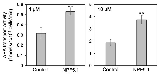 ABA transport activity of NPF5.1. The amounts of ABA (f moels/1 × 107 cells/min) taken into yeast cells expressing NPF5.1 or control cells containing an empty vector were determined when the substrate concentration was 1 or 10 μM. Results are presented as mean ± SD of three biological replicates. ** Significantly different compared with the values in the control cells (p < 0.001) by Student’s t-test.