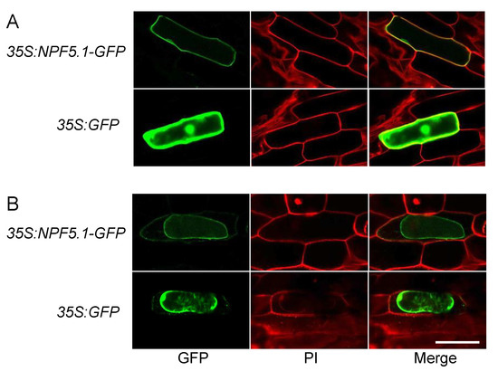 Plasma membrane localization of NPF5.1. GFP signals in onion epidermal cells that transiently express GFP-fused NPF5.1 or GFP alone under the control of the 35S promoter (35S:NPF5.1-GFP and 35S:GFP, respectively). Photos were taken before (A) and after (B) plasmolysis with 20% mannitol. PI indicates propidium iodide staining of the cell walls. Scale bar = 200 μm.