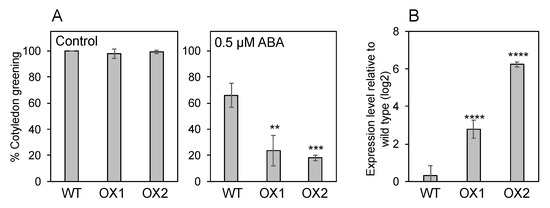 If NPF5.1 is localized to the plasma membrane and mediates cellular ABA uptake, overexpression of the protein should result in enhanced ABA sensitivity as we have shown for NPF4.6 [35]. Two independent transgenic lines that overexpress NPF5.1 (35S:NPF5.1) were tested for their responsiveness to exogenously applied ABA during germination. Our result indicates that the overexpressors were more sensitive to the treatment in terms of inhibiting cotyledon greening compared to the wild type (Figure 7).