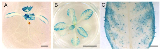 GUS staining was performed using a solution composed of 50 mM sodium phosphate buffer (pH 7.2), 10 mM EDTA, 0.05% (v/v) Triton X-100, 0.5 mM potassium ferrocyanide, 0.5 mM potassium ferricyanide and 1 mM X-Gluc. Close-up views were observed using a Leica M205 stereo microscope or a Leica DM2500 (Leica Camera AG, Wetzlar, Germany) microscope.