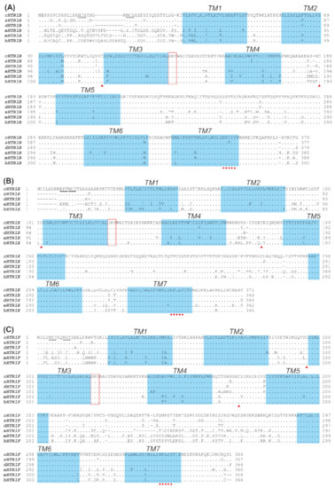Amino acid sequence alignment of chicken HTR1B, HTR1E, and HTR1F with that of other species. (A) Amino acid alignment of chicken HTR1B (cHTR1B, XP_015140120.1) with that of zebra finch (zHTR1B, XP_002190169.2), ducks (dHTR1B, XP_005017926.2), Xenopus tropicalis (xHTR1B, XP_002936251.2), mice (mHTR1B, NP_034612.1) and humans (hHTR1B, NP_000854.1). (B) Amino acid alignment of chicken HTR1E (cHTR1E, MK139005) with that of zebra finch (zHTR1E, XP_032603125.1), ducks (dHTR1E, XP_005013102.1), X. tropicalis (xHTR1E, XP_002933964.1) and humans (hHTR1E, NP_000856.1). (C) Amino acid alignment of chicken HTR1F (cHTR1F, MK139006) with that of zebra finch (zHTR1F, XP_002191608.1), ducks (dHTR1F, XP_005017708.2), X. tropicalis (xHTR1F, XP_002931817.1), mice (mHTR1F, NP_032336.1) and humans (hHTR1F, NP_000857.1). The conserved DRY motif is boxed in red, and TM1-7 (seven transmembrane domains) are shaded in blue. The red dots indicate the conserved NPXXY motif. The red triangles indicate the conserved cysteine residues for disulfide bond formation. The predicted N-glycosylation sites are underlined. ‘.’ represents identical amino acid, and ‘-’ indicates a gap in the sequence alignment.