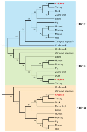 To investigate the evolutionary relationship of HTR1B, HTR1E, and HTR1F receptors in vertebrates, the amino acid sequences of HTR1B, HTR1E, and HTR1F receptors of different species were subjected to phylogenetic analysis. As shown in Figure 2, the receptor sequences form three clusters, with the chicken ortholog each found with its corresponding orthologs as expected. Notably, HTR1E cluster is closer to HTR1F cluster than to HTR1B cluster in vertebrates (Figure 2).