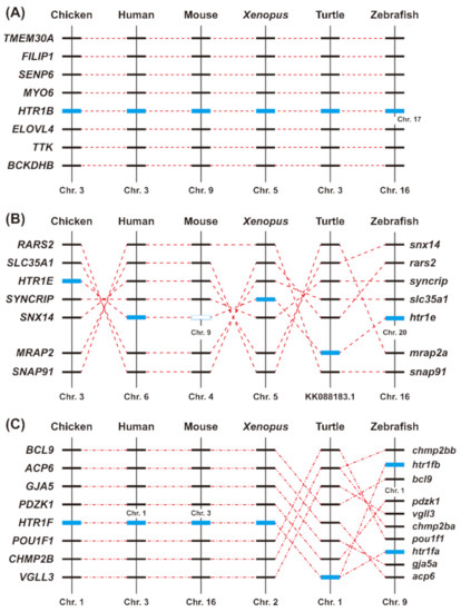 Synteny analysis of HTR1B, HTR1E, and HTR1F in chickens and other vertebrates. HTR1B (A), HTR1E (B), and HTR1F (C) are located in three syntenic regions conserved in vertebrate species, including chickens, humans, mice, X. tropicalis, painted turtles, and zebrafish. Blue boxes denote the genes of interest, while dotted lines indicate the syntenic genes identified in these species. Chr—chromosome.