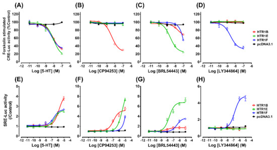 3.3. Functional Characterization of HTR1B, HTR1E, and HTR1F in Cultured HEK293 Cells