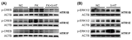 In addition, Western blots were performed to elucidate these signaling properties of chicken HTR1B, HTR1E, and HTR1F. As shown in Figure 5A, 5-HT treatment (100 nM, 10 min) could inhibit forskolin (2 μM)-stimulated CREB phosphorylation in HEK293 cells expressing HTR1B, HTR1E, and HTR1F, respectively. Similarly, 5-HT (10 μM, 10 min) treatment could enhance ERK1/2 (44/42 kDa) phosphorylation in HEK293 cells expressing HTR1B, HTR1E, and HTR1F, respectively (Figure 5B). These findings further supported the functional coupling of the three receptors to the cAMP/PKA and MAPK/ERK signaling cascade, in agreement with previous luciferase assay results.