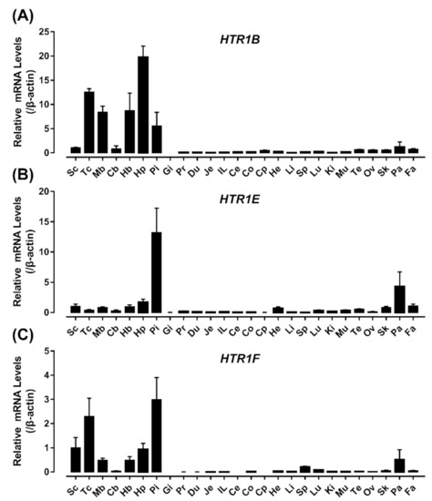 In this study, qRT-PCR was employed to detect the expression profile of HTR1B, HTR1E, and HTR1F in adult chicken tissues. Our current finding on chicken HTR1B mRNA expression being higher in the telencephalon, midbrain, hindbrain, hypothalamus, and pituitary gland than other peripheral tissues is consistent with the reports in mammals, in which HTR1B expressed highly in the hypothalamus and pituitary [58,59,60,61]. Nevertheless, it is worth noting that HTR1B mRNA expression in the cerebellum is relatively low in chickens (Figure 6A), which differs from the situation in mammals [58,60]. In zebrafish, HTR1B in situ labeling was also not detected in the cerebellum [62]. This could have occurred because of the diversity of brain architecture between mammals and birds/fish. The expression of HTR1B in thalamic nuclei has been implicated in controlling sensory maps in both the somatosensory and visual systems [63]. Consistent with the HTR1B distribution in the telencephalon of chicks [64], the high HTR1B expression in the brain region suggested the conserved modulatory function of HTR1B in chicken.
