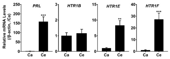 qRT-PCR assay of PRL, HTR1B, HTR1E, and HTR1F mRNA expression in the cephalic lobe (Ce) and caudal lobe (Ca) of adult chicken anterior pituitary, β-actin was used as an internal control. The mRNA levels of target genes were normalized by that of β-actin and expressed as the fold difference compared with that of the caudal lobe (Ca), **, p ≤ 0.01 vs. Ca; ***, p ≤ 0.001 vs. Ca. Each data point represents the mean ± SEM of six replicates (n = 6).