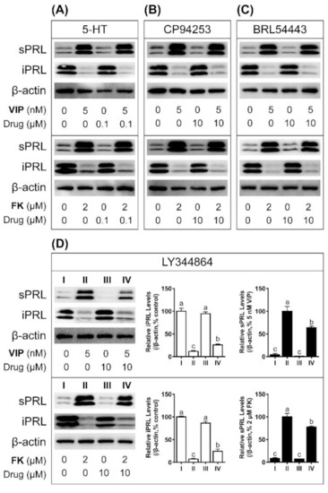 Western blot showing the effects of various selective agonists ((A): 5-HT; (B): CP94253; (C): BRL54443; (D): LY344864) on VIP (5 nM) or forskolin (FK, 2 μM)-stimulated cPRL secretion in cultured chicken pituitary cells. sPRL represents secretory PRL, and iPRL represents intracellular PRL. Protein levels were semi-quantified by densitometry, β-actin was used as an internal control. For the sPRL analysis, the 5 nM VIP or 2 μM FK treated group was regarded as 100%, while for the iPRL analysis, the control group (without any drug treatment) was regarded as 100%. Different letters indicate statistical difference between two groups (p ≤ 0.01), as determined by one-way ANOVA and a Tukey’s test. Each data point represents the mean ± SEM of three replicates (n = 3). The cPRL bands were observed at 24 kDa and 27 kDa (glycosylated form), as reported in our previous studies [36].