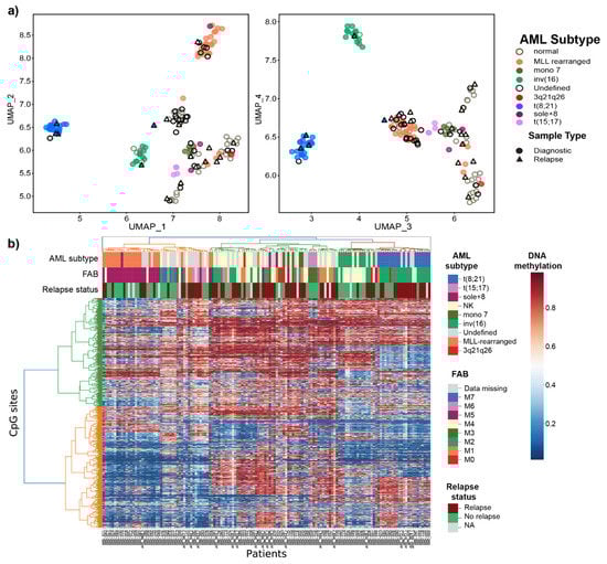 Data representation in space for the 142 pediatric AML patient samples for the selected 1300 CpG sites. (a) DNA methylation data projection in 2D space in a UMAP plot for UMAPs 1–2 (left) and 3–4 (right). Each point represents a patient sample. All samples are labeled by cytogenetic subtype, samples with unknown subtype (undefined) are shown as black circles with no fill (N = 24, diagnostic samples), and samples taken at relapse are shown by filled triangles colored by cytogenetic subtype (N = 19, relapse samples). (b) DNA methylation heatmap ordered by hierarchical clustering. Each row in the heatmap denotes a CpG site and each column is a patient. Cytogenetic subtype, FAB classification, and relapse status are shown as annotated bars over the plot.