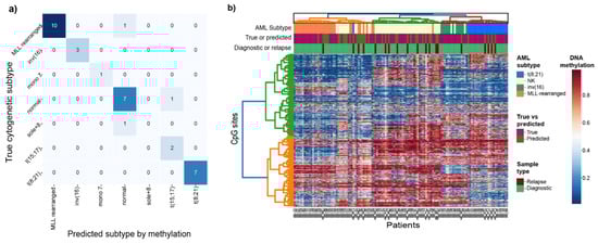 (a) Confusion matrix for the cytogenetically defined (diagnostic-known) vs. DNA methylation predicted cytogenetic subtypes (N = 33). (b) Heatmap and hierarchical clustering of 127 samples taken at AML diagnosis or relapse from patients belonging to the four subtypes most common subtypes; t(8;21)/RUNX1-RUNX1T1, inv(16)/CBFB-MYH11, MLL/KMT2A-rearranged and NK. The methylation status of the selected 1300 CpG sites are plotted in the heatmap. The samples are in columns labeled by AML subtype, whether the sample was cytogenetically defined (true/diagnostic-known) or cytogenetically undefined (DNA methylation predicted), and if the sample was taken at AML diagnosis or relapse.