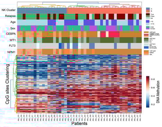 As observed in Figure 1 and Figure 2b, the NK group split into two distinctive groups based on DNA methylation levels. To further investigate intra-group heterogeneity of NK-AML, we performed unsupervised hierarchical clustering of all of the diagnostically defined NK samples (N = 30) as well as DNA methylation predicted NK samples (N = 15) using the previously defined 1300 CpG sites. Two well-defined clusters denoted as Cluster A and Cluster B emerged (Figure 3). We compared key molecular and clinical features available for this dataset, such as mutational status of genes of clinical interest (CEBPA, WT1, FLT3, and NPM1) from previous work [] as well as features such as age, sex, and clinical outcome between the two cluster groups (Table S1). Collectively, CEBPA, FLT3, NMP1, and WT1 mutations were enriched in Cluster B, with significantly higher proportion of patients in Cluster B (68%) displaying one or more mutations in comparison to only 18% of the A group (Fisher’s exact p-value 0.002). Although no significant difference was observed when each gene was analyzed independently (Table S4), most CEBPA mutated patients clustered together in a sub-cluster of Cluster B, suggesting a common underlying epigenetic signature associated with this mutation. Of the clinical features analyzed, the patients in Cluster B were significantly older at AML diagnosis (mean 10.8 years) than those in Cluster A (mean 4.5 years, t-test p-value 0.00004).