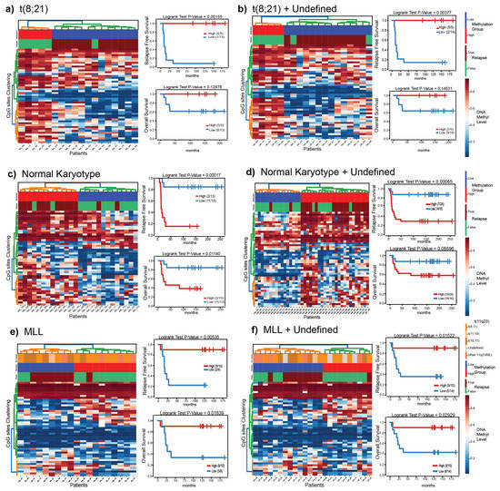 We identified variability in DNA methylation in the within-subtype groups of patients determined by diagnostic karyotyping and obtained two clusters of high and low methylation levels (Figure 4, heatmaps). Survival analysis on the groups of patients with subtypes known at AML diagnosis (Figure 4a,c,e right) revealed differences for all three subtypes (logrank p-value < 0.5) in RFS and OS while comparing the low and high methylation groups. Similar results were observed when the predicted undefined diagnostic samples were added in their corresponding subtype groups. Overall, the survival analysis revealed a relationship between patient outcome (relapse or death) and high/low methylation levels, in each of the three subtype groups (Figure 4). We included the DNA methylation group, treatment protocol, and risk group in a Cox proportional hazards regression analysis for RFS and OS. Treatment protocol had no systematic significant impact on outcome for NK or MLL/KMT2A-rearranged patients (Figures S7 and S8). The impact on risk grouping could only be evaluated in the patients with MLL/KMT2A-rearranged subtype treated on the NOPHO-2004 protocol, also showed no difference between standard and high risk (Figure S9). The t(8;21)RUNX1-RUNX1T1 group was not analyzed in the Cox regression because the majority (16/19) of patients were treated on the NOPHO-2004 protocol and all were treated as standard risk.
