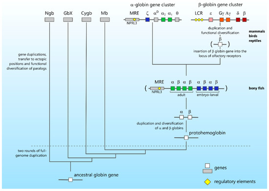 - Storz, J.F.; Opazo, J.C.; Hoffmann, F.G. Gene duplication, genome duplication, and the functional diversification of vertebrate globins. Mol. Phylogenetics Evol. 2013, 66, 469–478. [Google Scholar] [CrossRef] [PubMed]