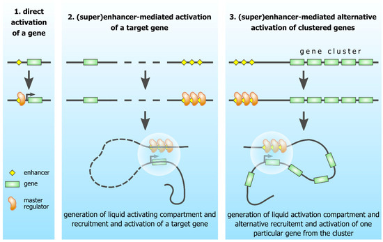 - Gurumurthy, A.; Shen, Y.; Gunn, E.M.; Bungert, J. Phase Separation and Transcription Regulation: Are Super-Enhancers and Locus Control Regions Primary Sites of Transcription Complex Assembly? BioEssays 2018, 41, e1800164. [Google Scholar] [CrossRef] [PubMed]