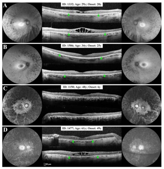 Ultra widefield (A,D) and 55° short-wavelength (B,C) autofluorescence imaging and spectral-domain optical coherence tomography of 4 affected members of family 0255. Panels (A,B) show 2 siblings with adult-onset disease. The younger sister (A) shows a more severe phenotype compared to the older sibling (B), despite similar duration of symptoms. The patient with childhood-onset disease (C) presented with complete disappearance of the ellipsoid zone (EZ) at age 48 years, whilst her sibling with adult-onset disease retained a greater than 2500 µm EZ span in the left eye at age 61 years (D). Green arrowheads show nasal and temporal EZ endings. Bilateral increased autofluorescence signal in the optic nerve heads in Panels (C,D) is due to the use of green excitation induced autofluorescence and brightness adjustment to improve contrast.