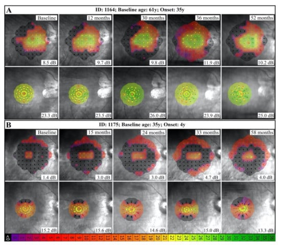 Serial 10-2 (macular) and 37R (foveal) MAIA in 2 patients with large deletions show short-term variation and long-term stability. Interestingly, the 61-year-old patient with adult-onset disease (A) had remarkably greater foveal and macular function compared to the 35-year-old patient with childhood-onset disease (B). Mean sensitivities are shown on bottom-right corner of each image.